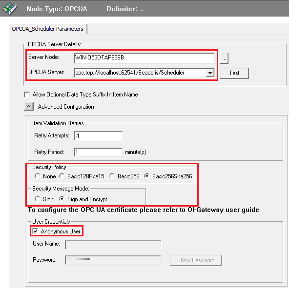 - OPCUA Server: Address of the OPC UA server on the machine where the "Scheduler Processor" service is installed