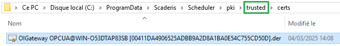 Copy this certificate to C:\ProgramData\Scaderis\Scheduler\pki\trusted\certs.