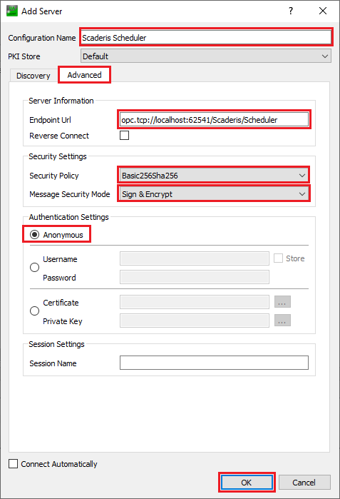 In the "Endpoint Url" field, enter the OPC-UA server address as displayed in the Scheduler Dashboard