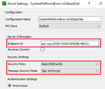 In the "Endpoint Url" field, enter the OPC-UA server address as displayed in the SMC during the OPC-UA service deployment