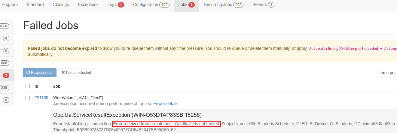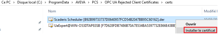 Move this certificate to the machine running the UA Expert solution (the one hosting the "Scheduler Processor" solution)