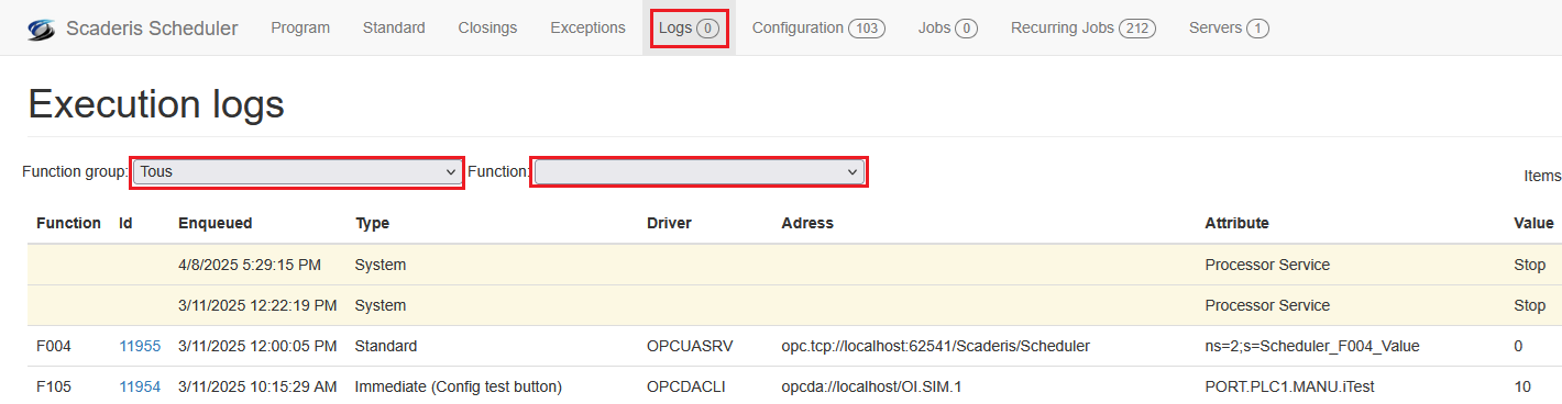 The log view allows you to display the execution history of tasks. To view the history, click on the "Logs" menu. By default, all tasks are displayed, from the most recent to the oldest.